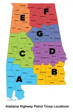 The Alabama Highway Patrol's troops cover the following counties as listed: