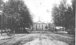 The courthouse was constructed with brick for the sum of $6,400[3] and was opened in 1852.[4] In 1888, 2 new wings were added to the courthouse and the exterior of the courthouse was stuccoed. The courthouse remained open until 1923, when the County Commissioners voted for a new courthouse to replace the over 70-year-old building. In 1914, a memorial to Confederate soldiers was added to the courthouse grounds.