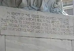 Erected in memory of the heroes who sacrificed their lives at the Alamo, March 6, 1836, in the defense of Texas. They chose never to surrender nor retreat; these brave hearts, with flag still proudly waving, perished in the flames of immortality that their high sacrifice might lead to the founding of this Texas.[5]