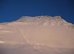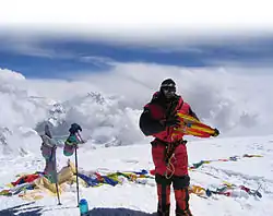 His 30 April 1990 ascent of Cho Oyu, which he completed alone in low visibility, is disputed by one observer.[24] Cho Oyu has a broadly flat summit plateau with no cairn (the traditional prayer flags on Cho Oyu's summit plateau do not mark the "technical" summit).[23] The summit is a small unmarked "hump" (or "bump")[22] (which many Cho Oyu YouTube summit videos miss).[25][26] While the height differential of this hump is small, Ralf Dujmovits, 3-time Cho Oyu summiter, notes that for a strong climber to get to the "hump" area can take another 30 minutes.[22]
