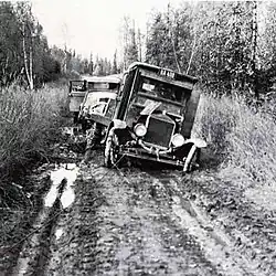The ARC got busy quickly, by 1907 the commission had flagged 247 miles (398 km) of winter trails on the Seward Peninsula, built 40 miles (64 km) of road, upgraded 200 miles of existing trails, and cleared 285 miles (459 km) of new trail. A significant project was construction of a spur trail from Gulkana on the Valdez-Eagle route to the new mining camp of Fairbanks.[4] By 1922 these numbers had grown to 1,101 miles (1,772 km) of wagon road including 600 miles (966 km) of gravel surfaced roads, 756 miles (1,217 km) of winter sled roads, 3,721 miles (5,988 km) of permanent trail and 712 miles (1,146 km) of temporary flagged trail.[7] By 1932 the ARC had built and maintained 1,231 miles (1,981 km) of roads, 74 miles (119 km) of tram road, 1,495 miles (2,406 km) of sled roads, 4,732 miles (7,615 km) of trails, 329 miles (529 km) of temporary flagged trails, 26 airfields, and 32 shelter cabins. Total expenditures were in excess of $18 million.[4]