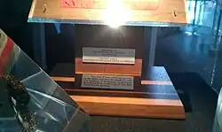 At the request of Nixon, NASA had about 250 presentation plaques made following Apollo 11 in 1969. Each included about four rice-sized particles of Moon dust from the mission totaling about 50 mg.[1][2] The Apollo 11 lunar sample display has an acrylic plastic button containing the Moon dust mounted with the recipient's country or state flag that had been to the Moon and back. All 135 countries received the display, as did the 50 states of the United States and the U.S. provinces and the United Nations.[1]