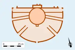 Excavations conducted in 2015 and a radar survey undertaken in 2020 largely corroborated and refined the descriptions established from the 17th and 19th-century surveys.[8] The performance building, which is in fact an arena theater, is situated in a manner that largely conforms to the slope of a valley, in accordance with its bowl shape.[96] Its diameter has been reevaluated to 72.7 meters.[97] The structure appears to be entirely built in small limestone masonry, without the use of architectural terracotta.[98] Its cavea is semicircular, extended by two corridors separating it from the stage wall, but no trace of the previously mentioned precincts is visible. The orchestra is a complete ellipse with a major axis measuring 24.2 meters and a minor axis measuring 23.2 meters. The five vomitoria exhibit a variable length according to the level of the cavea they serve. An edicule, which is likely an honor box, is positioned axially in contact with the orchestra.[99]