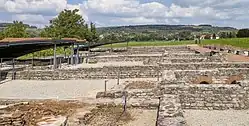 Following a comprehensive restructuring, the fanum was levelled and covered by a Roman temple on a podium (14.3 × 9 m). Two small structures were constructed in front of the temple on either side of its stairs. The peribolos was circumscribed by a portico on at least three of its four sides, measuring 45 m in width and at least 71.7 m in length. Two corner pavilions framed its eastern side,[112] constituting a layout comparable to that of the largest temple at the Altbachtal sanctuary in Germany.[113] It seems unlikely that this sanctuary was dedicated to imperial cults, as it does not integrate with the forum located to the south, is separated from it by a street, and does not face it. Instead, it appears to have been devoted to the city's tutelary deities.[114][115]