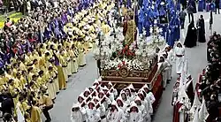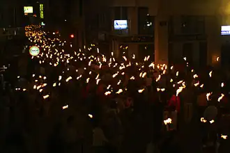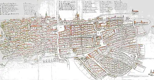 Social inequality in the 19th century was rampant, with overwhelming rates of illiteracy in areas dwelled by day laborers.[24] Meanwhile, the "middle class" consisted chiefly of civil servants and lawyers (thanks to hosting the seat of the Audiencia) as well a reduced number of merchants.[25] Street electric lighting was inaugurated in 1888, thus being the first capital of a province in Spain with electric lighting in its streets.