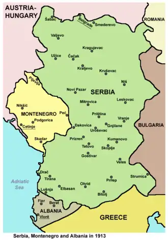 The Serb army first entered Ottoman territory inhabited by ethnic Albanians in October 1912 as part of its campaign in the then-ongoing First Balkan War.[7] The Kingdom of Serbia occupied most of the Albanian-inhabited lands including Albania's Adriatic coast. Serbian Gen. Božidar Janković was the Commander of the Serbian Third Army during the military campaign in Albania. The Serbian army met with strong Albanian guerrilla resistance, led by Isa Boletini, Azem Galica and other military leaders. During the Serbian occupation, Gen. Jankovic forced notables and local tribal leaders to sign a declaration of gratitude to King Petar I Karađorđević for their "liberation by the Serbian army".[8]