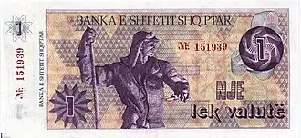 The lek (Albanian: leku shqiptar; indefinite singular lek, definite plural lekët, indefinite plural lekë; sign: L;[1] code: ALL) is the currency of Albania. Historically, it was subdivided into 100 qintars (Albanian: qindarka; singular qindarkë).