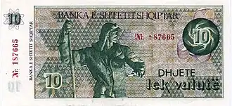 Due to the shortage of cash in circulation, in 1992, banknotes of 10 and 50 foreign currency leks (Lek Valutë ) were issued, while their value was increased 50 times: 10 foreign currency leks = 500 leks, 50 foreign currency leks = 2500 leks . The banknotes were in circulation for only one year and were soon replaced by banknotes of the 1992 model. A banknote of 1 currency lek was printed, but not put into circulation.[17]