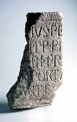 In 2001, extensive archaeological research started in the centre of Alphen aan den Rijn. Many findings were done here.[5] These excavations yielded large quantities of finds, and since the remains of the castellum were found below groundwater level, they were very well preserved and included organic remains. Remnants of the castellum, the canabae located close by and cemeteries were discovered. Pieces of two elongated buildings that may have served as storage were found and wooden-floored barracks. Furthermore, a number of military and personal objects belonging to the Roman soldiers were identified, such as writing utensils, a mirror, and over eight hundred coins dating from the reign of Roman Emperors Tiberius, Caligula, Claudius and Nero (between 14-68 AD). In addition, leftover food had been preserved, making it possible to research the farming techniques and eating habits of the soldiers. Foundations were exhumed, providing us with knowledge on building techniques used by the ancients Romans. In Albaniana stamps of the 'Classis Germanica', a Roman military fleet, were found.[6] A number of these discovered artifacts can be seen in the Rijksmuseum van Oudheden in Leiden.