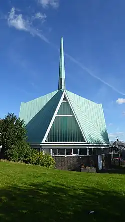Local Anglicans living on the estates found that they were two miles from the nearest Anglican church, and urged the Church of England to aid them. In 1944 the vicar of All Saints Church in Footscray began holding Anglican communion services in a room over the shops in Lewis Road, but by 1946 they were using a hall in Wren Road for this purpose. In 1954 a vicar was appointed to the town, and the Anglican community subsequently secured a plot of land in the centre of the estate on which to build a church; construction began in 1964 and was completed the following year.[4] The historian of architecture Nikolaus Pevsner later described it as "ingenious, fashionable and slightly absurd".[1] In 1969, Albany Park was granted parochial status by the Church of England, a special dispensation given that the area contained far fewer than the 10,000 residents normally required for such status to be granted.[1] In 1955, the local Baptists erected a church hall in Stansted Crescent; they had intended to construct a larger church, although this never materialised.[1]