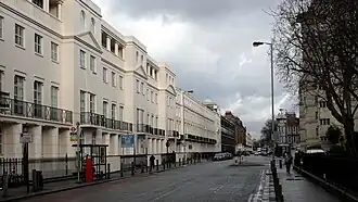 At 55 there is a blue plaque dedicated to the social researcher and reformist Henry Mayhew.[3] On the east side is the Antiochian Orthodox St George's Cathedral (formerly the Anglican Christ Church) which contains a stained-glass window by Dante Gabriel Rossetti.[4] At 152-4 was an ophthalmic hospital designed by John Nash; this was replaced by the "Regents Park Manufactory" where Goldsworthy Gurney built his steam carriages, while also working as a surgeon.[5] The site is now occupied by a pub called "The Victory". At 166, the poet Christina Rossetti lived for a couple of years.[6] Also on the east side is the Regent's Park Barracks.[7] At 197 there is a blue plaque dedicated to the composer Constant Lambert, who lived and died there with his wife, the painter and designer Isabel Nicholas (later Rawsthorne).[8]