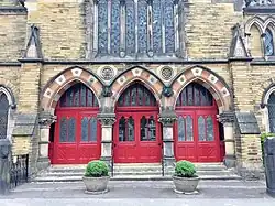 The founding of Albemarle Church dates to 1863, when forty-one people separated themselves for worship. Under the pastorate and leadership of the Rev. James Lewitt, the church was built and opened on 23 July 1867. Its architect was Henry Francis Lockwood of Bradford,[1] who worked extensively for one of the church's subscribers, Titus Salt,[2] and whose former apprentice Cuthbert Brodrick opened the Grand Hotel in the same year.[3] When in use after consecration, a school building and caretaker's cottage were found to be needed, and were built adjacent by 1868.[4]