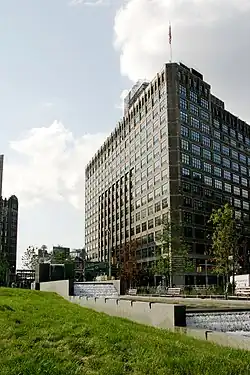 Ground was broken on the park in September 2008.[2] Opened in November 2009, the park cost approximately $3.4 million to build.[1] Formerly, the site was a parking lot.[1] Following September 11, 2001, the lot was used as a staging area for search and rescue operations.[3] In the following weeks members of the public placed flowers, cards and letters at the site, as it was one of the closest points to the former World Trade Center which was accessible.[3] The park features a 114-foot fountain designed by local artist Elyn Zimmerman which refers to the canal which formerly ran along the path of Canal Street.[1][3] In 2007 the design concept was recognized for Excellence in Design by the New York City Public Design Commission.[3]