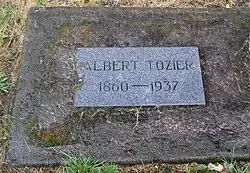 In the early 1930s, Tozier donated his collection of historical items, which included books, pictures, maps, and other items to the county historical society. The collection was this basis for what became the Washington County Museum.[8] In 1936, poor health kept him from ringing the bell at the Methodist Church, ending the 64-year tradition.[2] Tozier died on June 27, 1937, at the age of 77 and was buried at Hillsboro Pioneer Cemetery.[1]