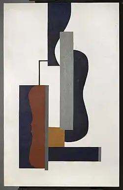 The composition of the Gallery of Living Art was informal and fluid, changing frequently as Gallatin added to his collection or simply wished to revise the display. Somewhat conservative at first, it grew to include major paintings in the cubist, neo-plasticist, and constructivist styles by artists such as Picasso, Braque, Gris, Fernand Léger, Piet Mondrian, Jean Hélion, and El Lissitzky as well as ones in the surrealist style by Joan Miró, Jean Arp, and André Masson.[4][5] Gallatin hung the gallery with the few large paintings occupying wall space by themselves. By the mid-1930s, these large paintings included Picasso's Three Musicians (1921), Léger's The City (1919), and Miró's Painting (Fratellini).[32] Most of the collection consisted of small works making it easy for moderately sized ones, such as Miró's Dog Barking at the Moon (1926) and Mondrian's Composition with Blue and Yellow (1932), to attract the viewer's notice.[2][5] During the 1930s Gallatin continued to receive advice from Jacques Mauny. He also was aided by a succession of friends and acquaintances beginning with Henry McBride (1927–32), followed by Robert Delaunay (1932–33), and then Jean Hélion and George L.K. Morris (1933 – ca. 1940). Following his own inclination and their influence, he purged figurative works in favor of abstraction and emphasized non-objective works over ones having identifiable subjects.[2][4][33]