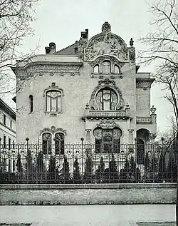 Kőrössy split from Sebestyén in 1899 and built his own house at Városligeti fasor 47 in Budapest, which was heavily influenced by Belgian, French and German Art Nouveau/Jugendstil. Having become proficient in the vocabulary of the style just when it was reaching its apogee elsewhere in Europe, he became a much-sought after designer in Hungary, helping to develop the Szecesszió into a kind of national style alongside many other architects, chief among them Ödön Lechner, who was nearly 25 years his senior. He was known for many residential commissions in Budapest, amongst them the Walko House at Aulich utca 3 (1901); the Sonnenberg twin apartment houses at Alkotás utca 5-7 (1904–05); the Gonda House at Práter utca 9 (1904–05); and the Sonnenberg House at Munkácsy Mihály utca 23 (1904). The latter was a few steps away from the grammar school at Munkácsy Mihály utca 26, now the Kölcsey Ferenc High School (1906–09), one of several schools that Kőrössy designed. Others included the Roman Catholic grammar school (now Unirea Liceum) in Marosvásárhely (now Târgu Mureş, Romania; 1903), and the Royal Hungarian State High School in Budapest, often called the Tündérpalota (Fairy Palace; 1909–11), now the National Pedagogical Library and Museum. In this building one can see the influence of Károly Kós and the Szecesszió architects interested in folk and vernacular themes and handcraft.[8]