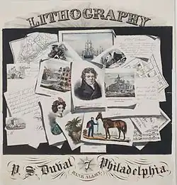 He started an engraving apprenticeship in 1827 under the tutelage of Cephas G. Childs and was taught the art of engraving on copper. Pendleton's Lithography had moved their operations from Boston to Philadelphia and began a business under the name Pendleton, Kearney and Childs.[15] They began to implement lithography into the business and hired P.S. Duval from Europe to implement the technique. Newsam learned the technique of drawing upon stone from Duval and became renowned for his portraiture.[16] Newsam's work was first published by Childs starting in 1829.[10] Newsam is credited with raising the prominence of lithography in the United States.[3] Childs left the business in 1835 and Newsam continued to work for the successor organization, Lehman & Duval which became P.S. Duval in 1837.[13]