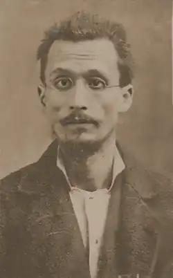 Thirty-six years old at the time of his conviction, Pel was, according to newspapers of the time, of average height and frail appearance.[12] His very distinctive features made as much of an impression on people at the time as the originality of his crimes. He combed his black hair upward, his face was thin and sallow, his cheekbones extraordinarily prominent; his eyes hidden behind gold-rimmed glasses; his nose beaked and pointed; his lips thin and discolored. He sported a black mustache and goatee. During the two trials, he appeared dressed in black and wearing a white scarf. The nonchalance journalists often noted in him contrasted with the seriousness of the charges against him. He proclaimed his innocence until the end.