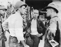 ![]() Brigadier General Albert W. Waldron (center, facing forward) commanding the 32nd Division Artillery, discusses plans for an upcoming battle, 15 November 1942. | |