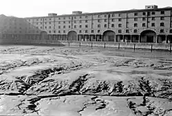 By the 1920s, virtually all commercial shipping activity had ceased at the dock, although its warehouses did remain in use for the storage of goods transported by barge, road or rail.[17][18] The onset of the Second World War, in 1939, saw the Albert Dock requisitioned by the Admiralty and used as base for the British Atlantic fleet. This included submarines, small warships, and landing craft docking. During the war, the dock was struck on several occasions by German bombs. This included one bombing raid in 1940 that damaged ships within the dock. More destructively, during the May Blitz of 1941, bombing caused extensive damage to the south west stack.[18] By the end of the war, almost 15 per cent of the dock's floor space was unavailable due to bomb damage.[19]