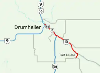 Highway 10 is a 22 km (14 mi) highway in southern Alberta, Canada that forms a part of Hoo Doo Trail. It is located wholly within the Town of Drumheller as a result of the former City of Drumheller's amalgamation with the Municipal District of Badlands No. 7 on January 1, 1998.[2][3] It begins at Highway 9 in the heart of Drumheller and extends southeast along the Red Deer River where it passes through Rosedale, then crosses Highway 56 and travels through East Coulee. It ends by splitting off into Highways 570, 564, and 569.