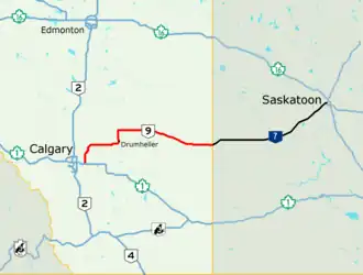 ![]() Alberta Highway 9 (highlighted in red) and Saskatchewan Highway 7 form a core route of the National Highway System between Calgary and Saskatoon | ||||