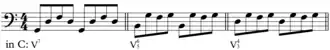 Alberti bass is a kind of broken chord or arpeggiated accompaniment, where the notes of the chord are presented in the order lowest, highest, middle, highest. This pattern is then repeated several times throughout the music.[5] The broken chord pattern helps to create a smooth, sustained, flowing sound on the piano. "Chords of harmony broken up into short patterns. Steady bass patterns in orchestral music which give the rhythmic drive to Classical music, compensating for the energetic drive of the Baroque basso continuo line."[6]