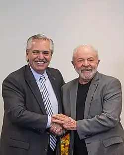 During his administration, Argentina's relationship with Brazil became somewhat strained.[66] Brazilian president Jair Bolsonaro refused to attend Fernández's inauguration, accusing him of wanting to create a "great Bolivarian homeland" on the border and of preparing to provoke a flight of capital and companies into Brazil.[67] Fernández and Bolsonaro had their first conversation through a video conference on 30 November 2020, during which both presidents agreed on the importance of cooperation and the role of Mercosur.[68]