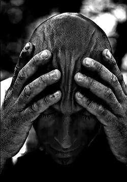 Very unusual subjects, as well as a surrealistic use of post-production (in digital form too) and/or weird settings characterise some of his later production. Among the most original works, a set of portraits of disabled persons and their inner world based upon Alice in Wonderland, and a remarkable series of hyper-realistic digital portraits called Dalla miniera ("From the mine"). One of the most interesting pictures in this series depicts Pasquale Montemurro, a former pupil and assistant to Terrile, while squeezing his own head between his hands in resignment or desperation, a feeling elicited using violent contrast on the scalp. As opposed to this, the model's look is somehow serene. Montemurro, at the time also a close friend of Terrile, died of cancer in 2010 at the age of 45, a few months after the picture was taken.