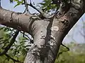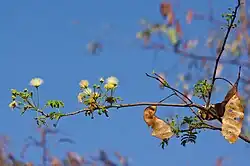 Albizia amara is a mid-sized, deciduous tree which resembles acacia without the thorns.[3] The bark of the tree is grey in color and is grainy and scaly.[3] The leaves consist of up to 15 pairs of side stalks and the leaflets are tiny and can consist of about 15–35 pairs.[3] The flowers are whitish-yellow powder puffs with long stamens and golden pollen.[3] The pods are flat and are about 20 cm long.[3] The leaves thin out during February–March and are renewed in April.[3] The flowers are present throughout May and the fruits ripen during October and November.[3] It is a host plant for Achaea janata.[4]