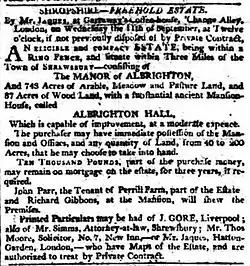 William Spurrier (1768-1848) was an attorney in Birmingham. In 1793 he married Eleanor Boole[7] and the couple had five children. They lived in Heath Green House near Birmingham and rented Albrighton Hall to wealthy tenants. One of these was Sir Richard Puleston who signed a lease in 1834.[8]