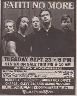 ![]() Poster for the September 23, 1997 concert at the Agora Theater in Cleveland with Limp Bizkit | |