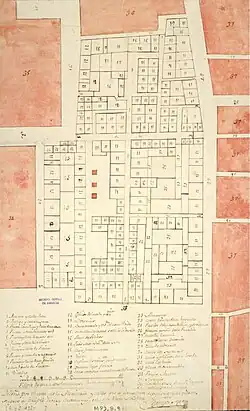 After the Christian conquest of the city by the Catholic Monarchs in 1492, ownership of the Alcaicería passed on to the Spanish crown, which continued to manage it as a guarded market. Its official name was the Real Sitio y Fuerte de la Alcaicería ("Royal Site and Stronghold of the Alcaicería").[5] A plan of the market drawn in 1787 by Tomás López Maño documents its layout. The plan shows that it was made up of various perpendicular streets and that it contained up to 152 shops.[5] The market was destroyed by fire in 1843 and rebuilt on a much smaller scale, using a different Neo-Moorish style that emulated Nasrid architecture.[1][6][7][4][5] The reconstruction reduced the Alcaicería in size and removed many of its smaller internal streets so that larger apartment blocs could be created.[5]