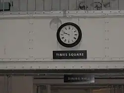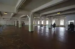 Alcatraz Dining Hall, often referred to as the Mess Hall, is the dining hall of Alcatraz Federal Penitentiary where the prisoners and staff ate their meals. It is a long wing on the west end of the Main Cellhouse of Alcatraz, situated in the center of the island.[1] It is connected to the block by a corridor known as "Times Square", as it passes beneath a large clock approaching the entrance way to the dining hall.[2] This wing includes the dining hall and the kitchen beyond it.