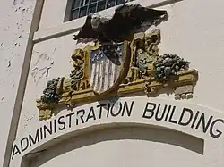 The main administration center was at the entrance to the prison, which included the warden's office. The office contained a desk with radio and telegraph equipment, typewriter, and a telephone.[37] The administrative office section also had the offices of the associate warden and secretary, mail desk, captain's desk, a business office, a clerk's office, an accounting office, a control room which was added with modern technology in 1961, the officers' lounge, armory and vault, and a visiting area and restrooms. The basement of Alcatraz prison contained dungeons and the showers. The main stairway to the dungeon lay along Sunrise Alley at the side of A-Block, but the dungeons were also accessible by a staircase in a trapdoor along the corridor of D-Block. All visits to Alcatraz required prior written approval from the warden.[38]