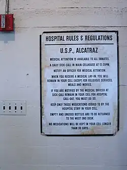 During its penitentiary years, the hospital was initially staffed by U.S. Public Health Service personnel who were assigned to the Federal Prison Service. While a physician was in residence on the island through the 1950s, cost-cutting measures included switching to private contracted physicians.[6] Two of the most notable hospital patients were Robert Stroud, the "Birdman of Alcatraz", who spent eleven years confined to the infirmary to separate him from the general population,[7] and Al Capone who spent more time in the hospital than in the general prison population.[8]