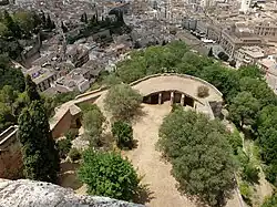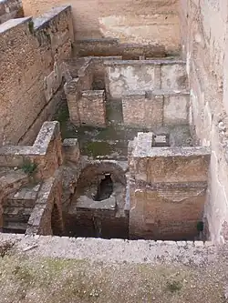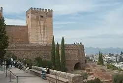 The Alcazaba is situated at the western tip of the Sabika hill, a promontory projecting from the foothills of the Sierra Nevada. It is a natural defensive position and was fortified from the 9th century onward.[1]: 23 A fortress (ḥiṣn) named Ġarnāṭa (also transliterated as Gharnāṭa) existed on the south side of the Darro River.[3] The settlement here had a mainly Jewish population and thus was also known as Gharnāṭat al-Yahūd ("Gharnāṭa of the Jews").[3] During the first Taifas period in the 11th century Granada became the center of a local Zirid kingdom whose rulers lived in a citadel and palace on the Albaicín hill known as the al-Qaṣaba al-Qadīma ("Old Citadel" or "Old Palace").[3][4] It was connected to two other fortresses on the Sabika and Mauror hills to the south.[4] The fortress on the Sabika hill was known as the al-Qasaba al-Jadida ("New Citadel").[5]: 149 [2]: 81, 293 It was probably of modest proportions compared to the present Alcazaba.[6] Its water supply was guaranteed by a cistern on site as well as by a wall with towers that descended down to the Darro River, allowing soldiers to safely collect water and bring it back up to the fortress.[7]: 179–181