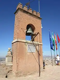Since the Christian conquest the tower is surmounted by a bell which could be rung to sound the alarm. The bell also rang at regular times during the day and night, which helped the city's residents regulate their days, and also rang to mark special days, such as the "Day of Conquest" which commemorates the surrender of the city to Catholic Spain on January 2, 1492.[11]: 282 [2]: 90 Because of this bell, the tower is also known as the Torre de la Campana ('Bell Tower').[2]: 90 The bell was formerly located at the northeastern corner of the terrace but was moved to its current central and western location in 1840. Due to its regular use, the bell also had to be replaced in 1569, 1598, 1624, 1640, 1655, and for the last time in 1755, when the current bell was installed. The belfry was also destroyed by lightning and reconstructed in 1882.[2]: 90 The bell became a symbol of Granada and was integrated into the city's coat of arms in 1843.[2]: 90