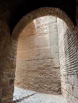 The fortress is protected by multiple layers of walls. This is especially evident on the northern side, where it is defended by up to three lines of walls corresponding to different elements of the Alhambra's defensive system.[2]: 86 The inner wall is tall and punctuated by three small rectangular towers or bastions, with Zirid foundations. It connects to the Torre del Homenaje at one end and the Torre de la Vela at the other end. The second wall, below the inner wall, corresponds to an outer enclosing wall that surrounds the entire Alcazaba known as the adarve ('rampart'). The third and outermost wall is part of the longer perimeter wall that encloses the entire Alhambra. In this area it also protects the road that runs between the city and the Alhambra's interior, passing through the gate known as Puerta de las Armas ('Gate of Arms').[2]: 86 Within the area of this outer rampart, near the Puerta de las Armas, is a ruined structure that formerly housed the stables.[2]: 91 The main southern and eastern walls of the Alcazaba, which form the other two sides of the "triangle", also stand behind an outer enclosing wall.[2]