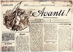In 1900, he took part in the founding of the socialist newspaper Avanti!, which took its name from its Italian namesake and intended to be an organ at the service of workers and social struggles.[10] The newspaper had a good circulation among the Italian community in São Paulo and, in general, advocated social reforms that could benefit the working class and the formation of workers associations of resistance aimed at improving workers living conditions.[11] Avanti! was one of the first left-wing periodicals to be published in Brazil, and its editors sought to unite their efforts with the various socialist tendencies, so that in the pages of the newspaper there was room for more reformist positions, such as those of Alcebíades Bertolotti, and also for more radical positions, such as those of De Ambris.[12] At the end of September 1901, when the newspaper was about to complete a year in circulation, De Ambris published an article in which he invited workers in Brazil to organize themselves autonomously, claiming that many improvements could be achieved directly through the action and organization of the working class. In the following issue, Bertolotti, in response, argued that workers organizations had the aim of raising wages and improving the lives of the working class, but that this should not lead to the conclusion that economic associations should disregard the role of the state and the party and that workers organizations could not and should not, in a way, exert pressure on them.[13] Despite the polemics, the socialist idea of the need for a trade union for economic struggles and a party for political struggles prevailed in Avanti!.[12] De Ambris himself, at a socialist congress held between 30 May and 2 June 1902, defended electoral action, declaring the need for socialists to register on electoral lists and inviting foreigners to abandon nationalism and become naturalized in order to enjoy the right to vote.[14]