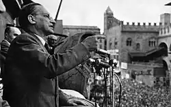 In 1954, De Gasperi also had to give up the leadership of the party,[21] when Amintore Fanfani was appointed new Secretary of the Christian Democracy in June.[22]