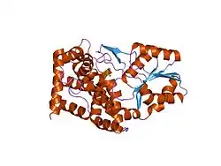 The first-ever isolated alcohol dehydrogenase (ADH) was purified in 1937 from Saccharomyces cerevisiae (brewer's yeast).[14] Many aspects of the catalytic mechanism for the horse liver ADH enzyme were investigated by Hugo Theorell and coworkers.[15] ADH was also one of the first oligomeric enzymes that had its amino acid sequence and three-dimensional structure determined.[16][17][18]