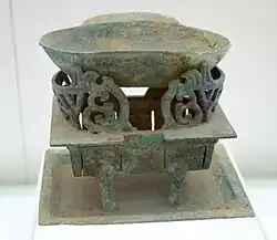 Within the Yellow River area which gave rise to the Chinese culture, numerous bronze vessels preserved from the later Shang dynasty (whose oracle bones contained the first surviving Chinese characters) include many which were apparently used to warm alcohol.[5] At the time, millet was the area's staple grain and these drinks may have been similar to modern huangjiu. Traditional Chinese historical accounts such as Sima Qian's Records of the Grand Historian relate various legends and myths concerning the origin of alcohol in China. One account says that the brewer Yidi presented the first alcoholic beverage as a gift to the emperor Yu the Great c. 2100 BC.[6] Another credits its invention to Du Kang.