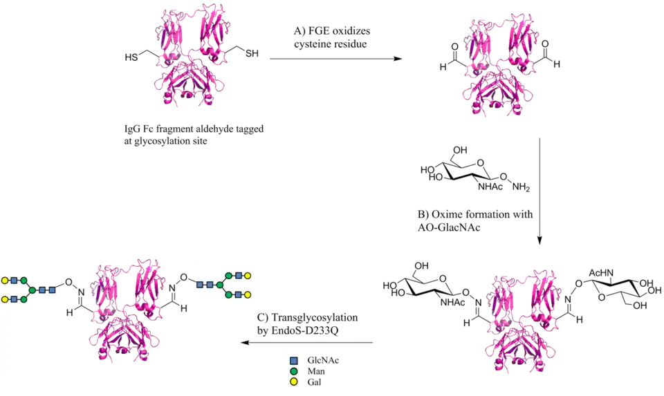 A successful chemical glycosylation of the Fc IgG fragment was achieved which resembles the natural occurring glycosylation pattern. The study discussed above focused on the IgG antibody, however, the application of the aldehyde tag for glycan conjugation could potentially be extended to other proteins.[22]