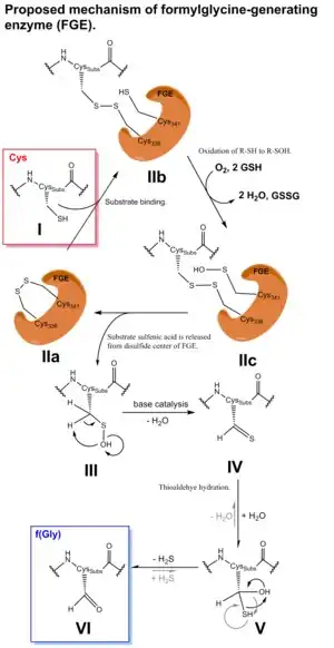 The catalytic mechanism of FGE is well studied. A multistep redox reaction with a covalent enzyme: substrate intermediate is proposed. The role of the cysteine residue for the occurring conversion was studied by mutating the cysteine to alanine. No conversion was found using mass spectrometry when the mutated peptide tag was used.[3] The mechanism shows the important role of the redox active thiol group of cysteine in the formation of f(Gly), as seen in Fig. 2. The key step of the catalytic cycle is the monooxidation of the cysteine residue of the enzyme, forming a reactive sulfenic acid intermediate. Subsequently, the hydroxyl group is transferred to the cysteine of the substrate and after hetero-analogous β-elimination of H2O, a thioaldehyde is formed. This compound is very reactive and easily hydrolyzed, releasing the aldehyde and a molecule of H2S,[20][21][12]