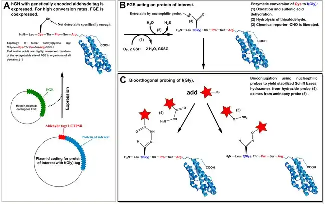 The formylglycine tag or aldehyde tag is a convenient 6- or 13-amino acids long tag fused to a protein of interest. The 6-mer tag represents the small core consensus sequence and the 13-mer tag the longer full motif. The experiments on the genetically encoded aldehyde tag by clearly showed the high conversion efficiency with only the core consensus sequence present. Four proteins were produced recombinantly in E.coli with an 86% efficiency of for the full-length motif and >90% efficiency for the 6-mer determined by mass spectrometry.[3] The size of the sequence is analogous to the commonly used 6x His-Tag[18] and has the advantage that it can also be genetically encoded. The sequence is recognized in the ER solely depending on primary sequence and subsequently targeted by FGE.[11] Notably, in the setup of recombinant expression proteins in E. coli a coexpression of exogenous FGE aids full conversion,[3] although E. coli has endogenous FGE-activity.[19] The introduction of an aldehyde tag has a workflow that consists of three segments: A the expression of the fusion protein, that carries the peptide tag derived from the sulfatase motif, B the enzymatic conversion of Cys to f(Gly) and C the bioorthogonal probing with hydrazides or alkoxy amines (Fig. 1).