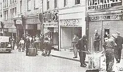 The rioters returned again on the evening of 5 July and gathered in Princes Gardens before marching on Union Street, where they threw bricks and stones at cars, smashed the remaining undamaged shop windows, threatened shopkeepers and broke into a brewery where they helped themselves to the stock.[1] The Canadian Military Police tried to forcibly quell the riot, which continued for more than two hours, ending around midnight. A Canadian officer who tried to send them back to their barracks told them, "You are giving Canada a bad name. Canadians are getting a fair share of boats but the shipping position is most difficult."[2] In total about £10,000 in damages was caused over the two evenings.