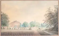 Aldershvile was built by Johan Theodor Holmskjold, who was director-in-chief both of the Royal Danish Postal Services and the Royal Porcelain Factory. In 1782, one year after his ennoblement, he commissioned the architect J.B. Guione to build him a new and larger country house as a replacement for his old country hose, Sophienholm, which he found had become too small. The house was not completed until 1790. It was a white building with a hipped roof clad in blue-glazed tiles. It was surrounded by a 12-hectare English-style landscaped garden with a canal system.[1]