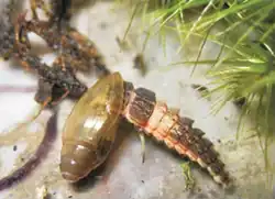 It was found that attacks took place both during the day and at night with the operculum of the snail being targeted.[2] The larva spent up to 24 hours inside the shell devouring the soft tissues.[2] Sometimes several first-instar larvae attacked a single snail at the same time.[2] On some occasions, the snails H. aspersa and C. pictum emitted a protective foam which enabled them to thwart the attack.[2]