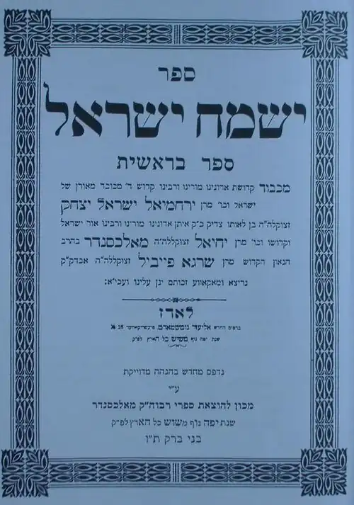 - Yismach Yisroel – The fundamental text of Aleksander ideology. Written by Yerachmiel Dancyger, including many of the teachings of the first Rebbe R' Yechiel. Completed after his death by his brother Shmuel Zvi. (Lodz, 1911)